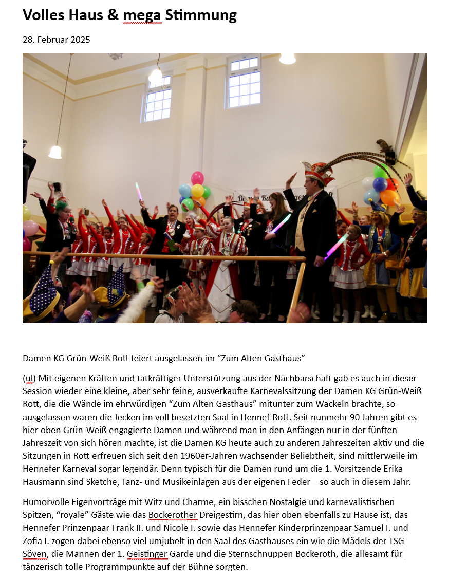 Auch in der lokalen Presse finden sich Berichte über die Damen Karnevalsgesellschaft Grün Weiß Rott. Anbei ein paar Beispiele aus den letzten Jahren